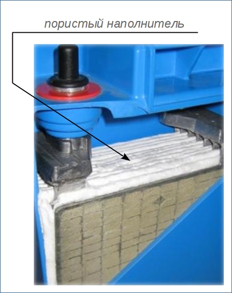 The glass fiber packing of the cells is not completely filled with electrolyte, there is some space for the recombination of electrolysis gases. If the charge current slightly exceeds the certified values, these gases are released (hydrogen and oxygen during recharging) in an insignificant amount. However, this is enough to swell and break the case. Therefore, a safety valve is installed in the battery.