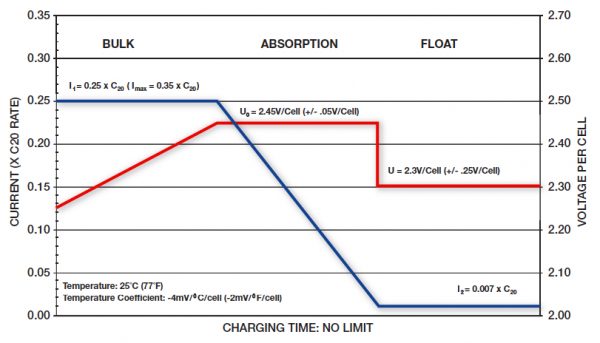 The charge in 3 stages begins with a stabilized current, a quarter of the rated capacity. For a battery of 80 A / h, this is 20 A (not more than 28 A). The temperature should not exceed 35 ° C, otherwise the battery life is reduced. The device monitors the voltage, and when it reaches 2.45 V per can, it switches to voltage stabilization mode. The charge current gradually decreases. When it is installed at about 0.5 A, the device switches to storage mode (self-discharge compensation, float) and stabilizes the voltage at 2.3 V per bank.