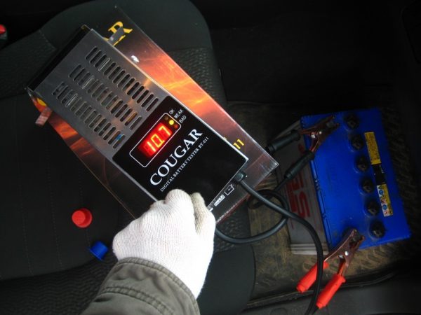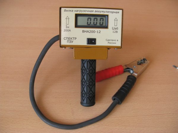 A fully charged battery will have to be tested for operational readiness. For this, the working resistance of the plug is connected for a few seconds.According to the voltmeter, the degree of battery availability is determined.
