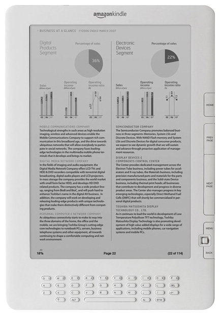 The first device that was released by the company under its own brand is an electronic book. The device was called Kindle and was released in 2007 at a price of $ 399. The first batch dispersed in just 6 hours and was a resounding success. The reader was innovative in its own way, at the bottom of the case there was a keyboard for entering text and searching for books in the file manager, and on the side faces there were mechanical buttons for turning pages. Initially, the device was sold only in the United States, but this did not stop it from gaining popularity around the world, since starting from the second generation it was sold everywhere.