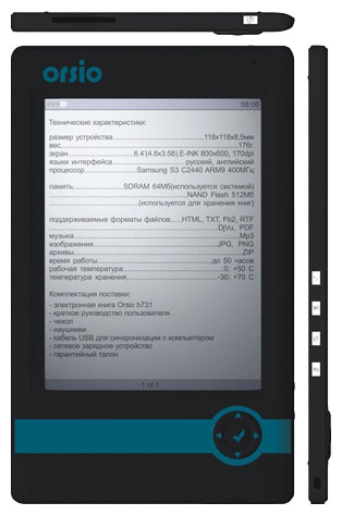 The book is also discontinued. We can say that ORSIO b731 is its newer counterpart. But in the years of release was considered a leader among electronic readers. Just like its descendants, it has electronic ink eINK VizPlex, which for that time was a novelty. Control panel on the left front.