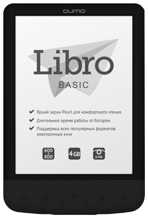 Among the advantages note 4 GB of internal memory, this is usually enough for a standard user. Also, unlike many other e-books, Qumo Libro Classic after it finally sat down, just a minute of recharging is enough for the device to turn on. Since there is a keyboard on the front of the case, you can type on it, although this is not very convenient due to the small size of the buttons. The built-in accelerator allows you to rotate the screen as needed.