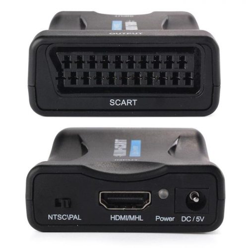- A SCART cable is inserted into the adapter on one side, and an HDMI on the other, which will then be connected to the console;