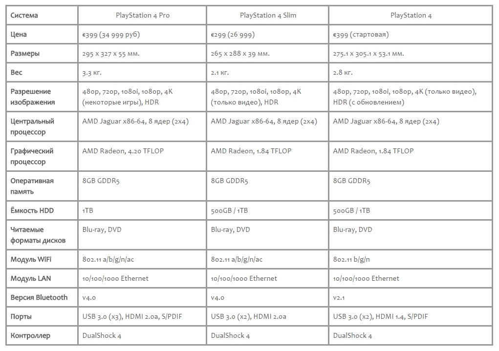 Although the processor itself is the same in all three systems, in the Pro version it is overclocked to 2.1 GHz, and the original works at 1.6 GHz. It also has a graphics processor capable of squeezing out 4.20 teraflops, while the graphics processor in the "thin" version and the original performance reaches only 1.84 teraflops.