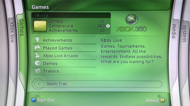The operating system interface consists of four main pages with a different color background: xbox live, games, media, system. Here is the choice of options: