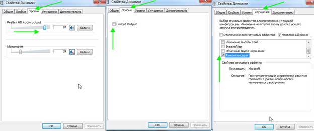 If Windows 8.1 is installed, then in the "Improvements" tab, try changing the settings in the "Enable Room Correction" and "Enable Sound Equalizer" sections.