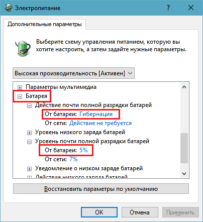 - In the “Almost completely depleted batteries” section, select “From battery: hibernation”. In the section “Almost full battery discharge level”, select the lowest value.
