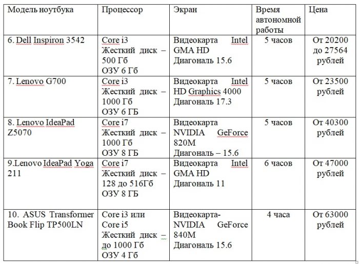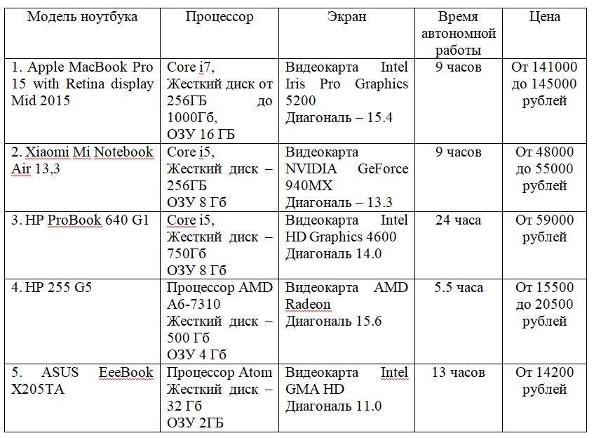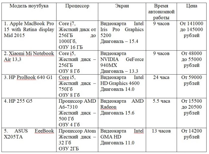 Characteristics of the first 5 laptops from the rating