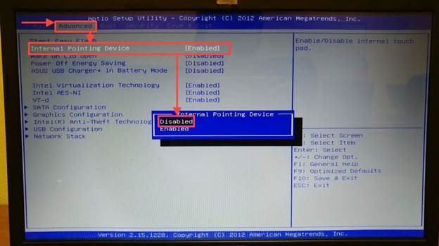After entering, you need to move to the Advanced tab. In it, select the tab "System Properties", and then "Mouse / Keyboard features" and then go to the tab "Internal Poiting Device". There will be a “Disable” item, which you need to select and activate with the Enter key. That's it, the touch screen will be turned off, and now you can leave Bios, after saving all the settings. This can be done using the Esc key and following the prompts on the laptop screen.