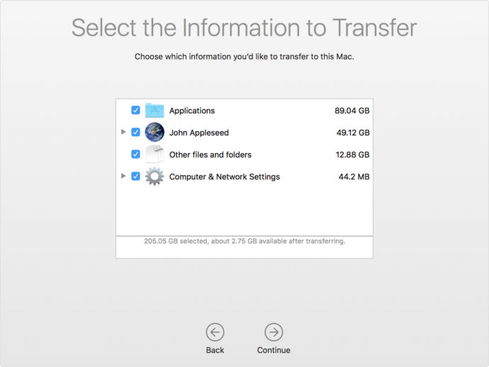 After all the actions are confirmed, you need to choose which data will be transferred. If you need to make an exact copy of the operating system and data on another MacBook, then you should select all the items.