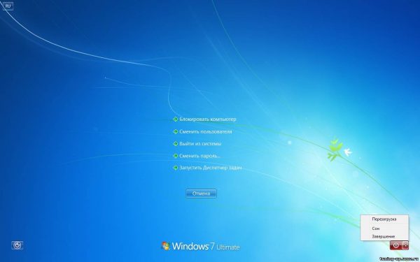 Pressing the key combination Ctrl + Alt + Delete also leads to the appearance of a dialog box. At the bottom right of the screen is a red shortcut that you need to click on using the Tab control button. To open the context menu, use Tab to move around the screen from one command to another and with arrows. In the menu you must select the option to reboot the device.