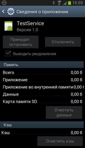 4. In the smartphone settings, select "All applications" - "Test Service" - "Stop" - "Clear".