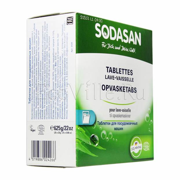 When answering the question about which means in the form of tablets for the dishwasher is better, it is necessary to note the products of the Sodasan brand. They qualitatively eliminate fats, and acts safely on equipment. The manufacturer does not recommend using the product for washing porcelain, silver and crystal products. The cost of 30 tablets is 650 rubles.