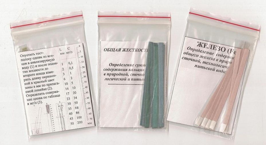 The principle of operation of all such test strips is identical: they are immersed in water for a minimum amount of time (from 1 second to 3 seconds) and after drying they acquire a certain color.
