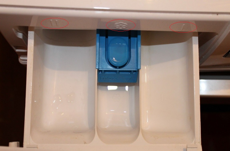 - The tray is divided into 3 compartments - the first 2 are used for powder, and the third for air conditioning. Depending on the washing mode, it is necessary to determine the powder compartment (there is a detailed distribution on the front side of the tray).For example, when washing at a temperature of 90 degrees, the powder is poured into the first compartment.