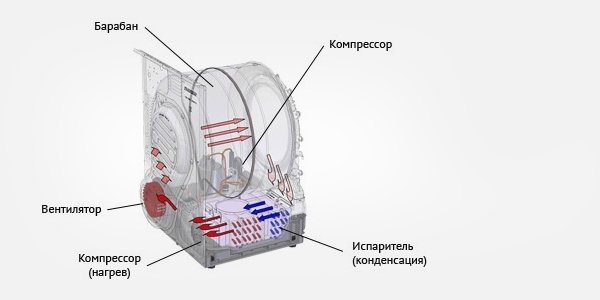 After a thorough extraction, air of a certain temperature is supplied to the drum of the washing machine. For this, a special heater is used. Fans are responsible for the direction of air flows and their movement in the drum. The degree of drying is determined by humidity sensors built into the drum. Condensate from the laundry is removed in a special container, at the end of the cycle it must be cleaned.