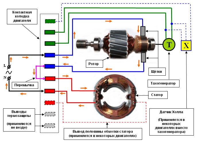 Keep in mind that different models of engines can have wires of different colors, but the principle of their connection is the same in all cases.To detect the pairs, it is necessary to ring the wires in turn (those: those that are designed for the tachogenerator must have a resistance of 60 to 70 Ohms). It is better to glue these wires with electrical tape aside from others, so as not to get confused. The remaining wires also need to ring to identify the pairs.