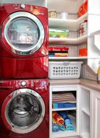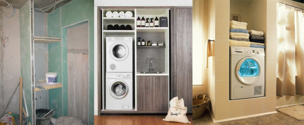 During home repairs, you can think over the installation option of the dryer and pre-engage in the manufacture of niches for it from plasterboard plates. The option is more difficult, but more comfortable to use - to build a tall cabinet for installing a column of equipment. The examples presented in the photo will help you realize these ideas.