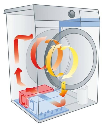 - Condensation machines act as follows: the air is heated and fed into the laundry compartment, where it draws in moisture, then it is passed through a heat exchange unit. Condensate remains in a special container, which must be emptied after each drying cycle.
