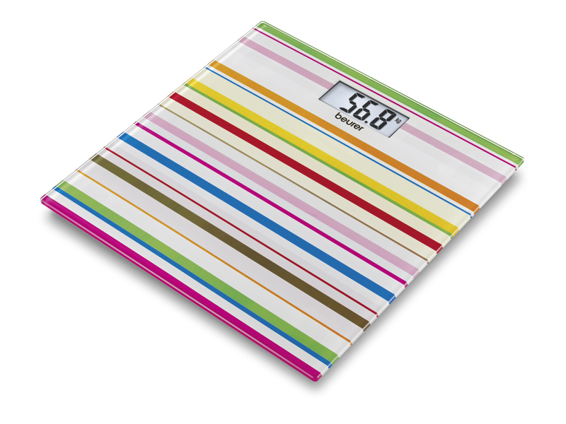 - Beurer GS 27 Happy Stripes is one of the best glass floor scales in a bright, interesting design and minimal thickness, which greatly simplifies storage. Designed only for measuring the weight of a person, with increased accuracy. Maximum load -150 kg, measurement accuracy - 100 g.
