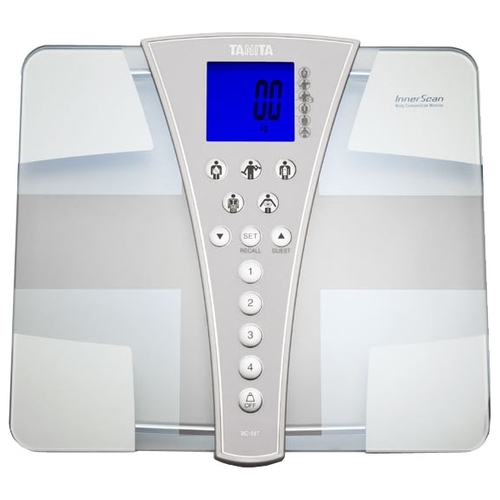 - Tanita BC-587 - the best glass household floor scales made of tempered glass, with a maximum load of 200 kg and a measurement accuracy of 0.1 kg. The features of these scales include the built-in analyzer, which determines the percentage value of bone, fat and skin tissues in the human body, as well as the amount of water in it. In addition, the device performs the calculation of body mass index, determines the level of physical condition, physical type and biological age in the range from 12 to 50 years. Provides memory for 4 people and display backlight;