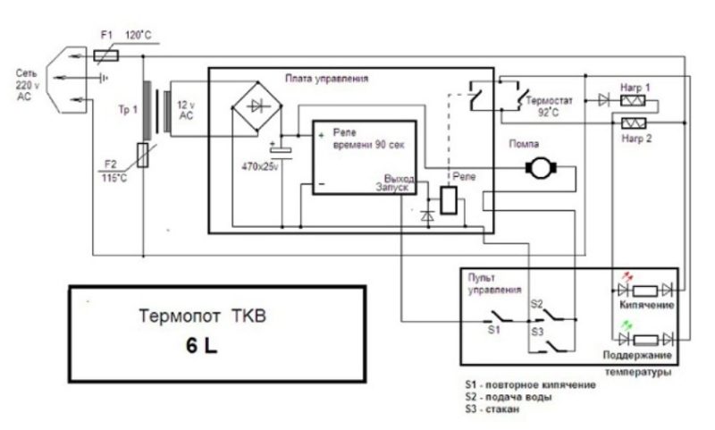 Thermopot is a modern electric device that combines the functions of a kettle, thermos and cooler. This performance provides ease of use, which consists in providing hot water at any time without the need to wait for its temperature to rise to the required level. The thermal sweat scheme implies the inclusion of the following structural elements: