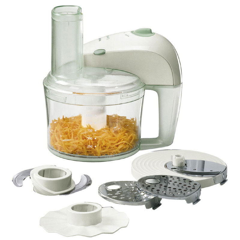 The MUM 4855 multifunctional food processor is easy to use. The machine easily copes with any work: cuts, whips, grinds, kneads the dough, squeezes juice from citrus fruits. Despite the small power (600 W), the meat grinder cranks rather tough meat, including those with small veins. There are functions of a mixer and a blender.
