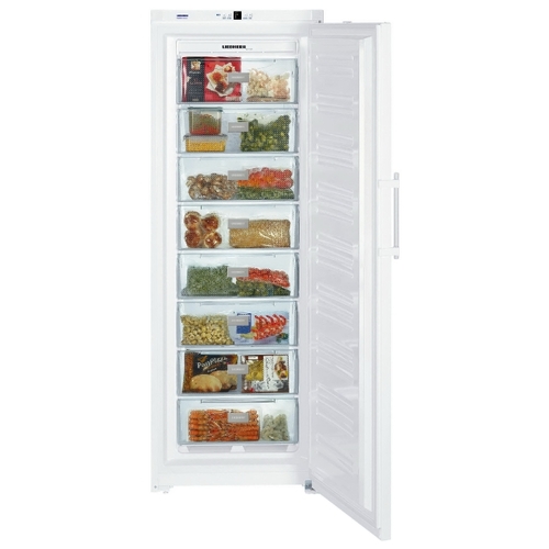 - Liebherr GN 4113 is a tall (69.7 x 75 x 194.7 cm) and economical in terms of electricity (class A ++) unit, in which up to 26 kg of food can be frozen at a time. The total volume of the freezer is 406 liters. No frost mode will facilitate the operation of the device. There is a sound indicator of an open door and high temperature, express freeze function. The freezer provides a choice of door installation. The only drawback is that after closing the door you have to wait a couple of minutes before opening it again.