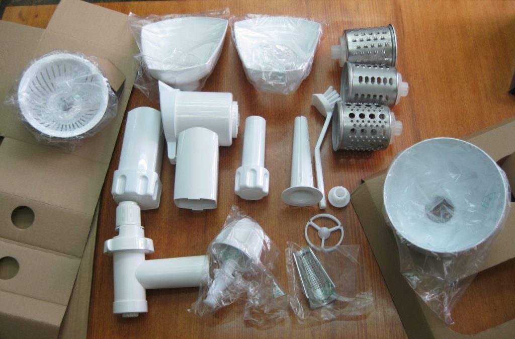 - Additional nozzles: nozzles for vegetables quickly chop fruits and vegetables; grater will cope with vegetables and cheese; nozzles for sausage and kebbe will help in the preparation of various sausages. Forming devices will cut the dough into cookies; the coffee grinder will grind coffee grains, spices, nuts; a juicer will help squeeze the juice; Nozzle for tomatoes will not allow seeds and peel to get into home ketchup. Pasta discs and cutlet shapes can also be included. Of course, not all of these nozzles must be included. But you can buy them if you wish. Before buying, you should consider whether this or that nozzle is really needed and how often it is supposed to be used. Separate models of meat grinders have compartments in the case for storage of nozzles and a cord.