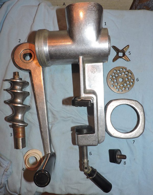 1. Housing 2. Handle 3. Screw shaft (spiral) 4. Rubber retainer 5. Cross-shaped knife 6. Lattice 7. Pressure nut 8. Handle retainer A. Meat receiver B. Presser foot