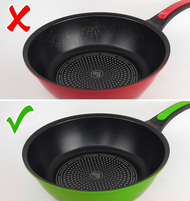 The material of the non-stick pan becomes thinner over time, in addition, it is subject to any mechanical stress.