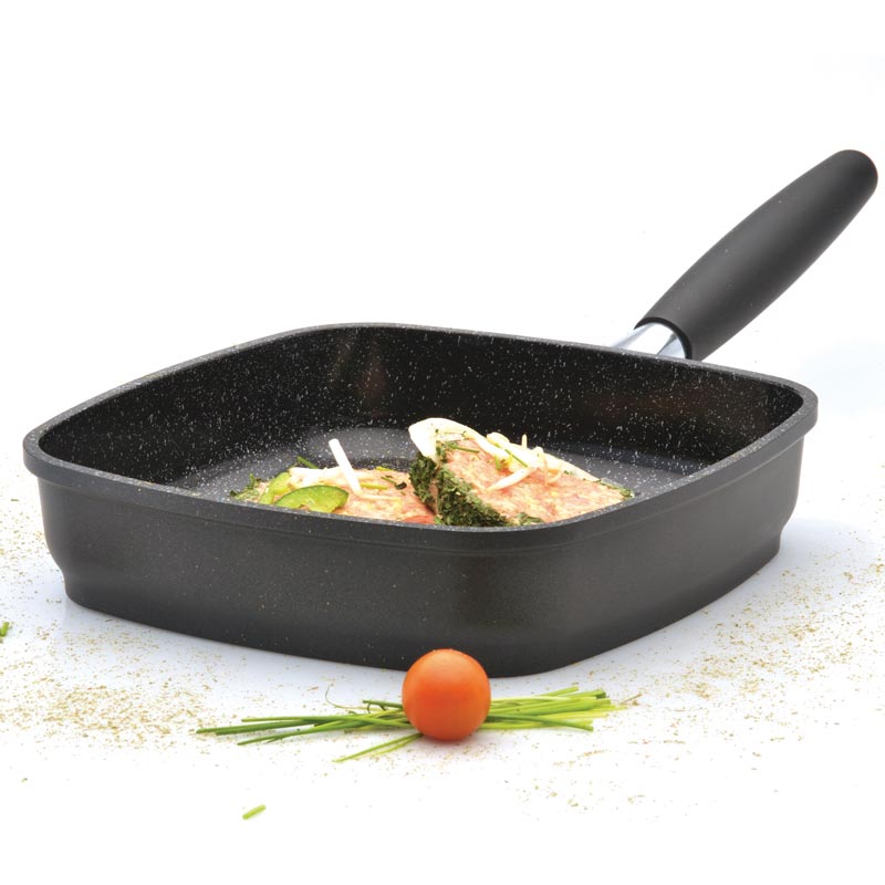 - Grill. Such a pan can always be recognized by the ribbed bottom imitating traces of the lattice. Such dishes allow you to cook various dishes with virtually no oil. The bottom structure protects the products from oil soaking. This fact suggests that the cooked food in such a dish is not as harmful as after cooking in an ordinary frying pan.