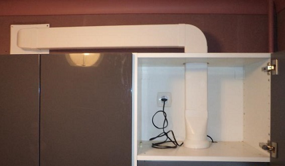 - Installation of a hinged cabinet. A cheaper, but very practical option: a cabinet is mounted on the wall with cut out holes through which part of the exhaust system will pass. There is free space for the necessary things in the kitchen.