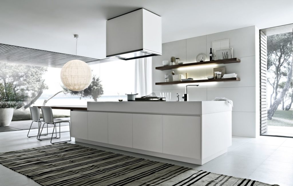 Island hoods are most often installed in spacious kitchens, where the stove is located in the middle of the room. This type of device is attached to the ceiling.