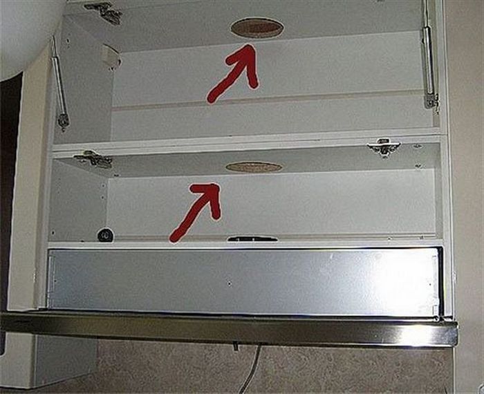 It is worth using a cabinet with a modified upper and lower shelf. It is important that there is a possibility for cutting openings for the duct.