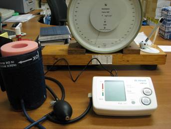 Simple construction mechanical tonometer consists of a pear, pressure gauge and shoulder cuff. They are connected together in a single system, the pressure in which is always the same. A mechanical device can be used as a reference in parallel measurement.