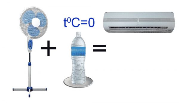 By this principle, all simple air conditioners are created. There is always an element that carries with it cooling and a second object, it already performs the function of spreading the desired coolness. The main advantage of this method is reusable, cheap price, as well as instant and easy assembly. Even a child can cope with such a task.