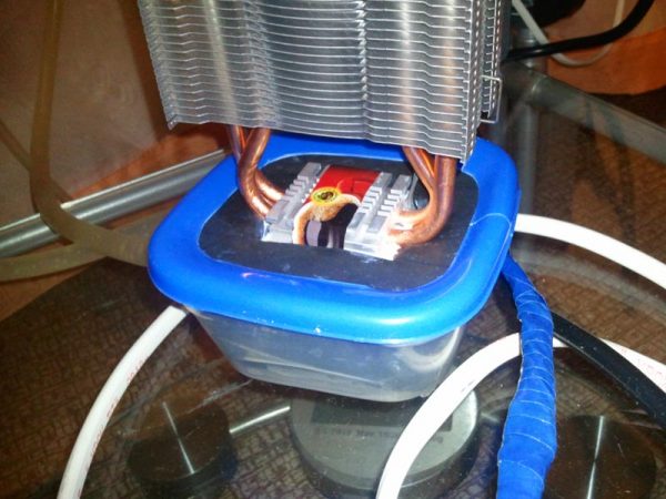 - We put the cooler on top and check its operation. The bottom line is that air should be drawn into the container. When the system is set up, you need to use a gun with glue and gently fix the elements.
