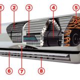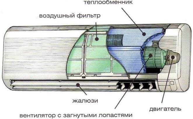 - Indoor unit. It combines an evaporator, which cools the air, fan and mechanical parts: shutters, filter insert, condensate drain pan.