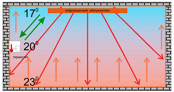 - Uniformity of heating the room in height, especially when using ceiling emitters. This is especially important for children playing on the floor and pets. This property is also useful for farm animals and birds placed in cages in several tiers.