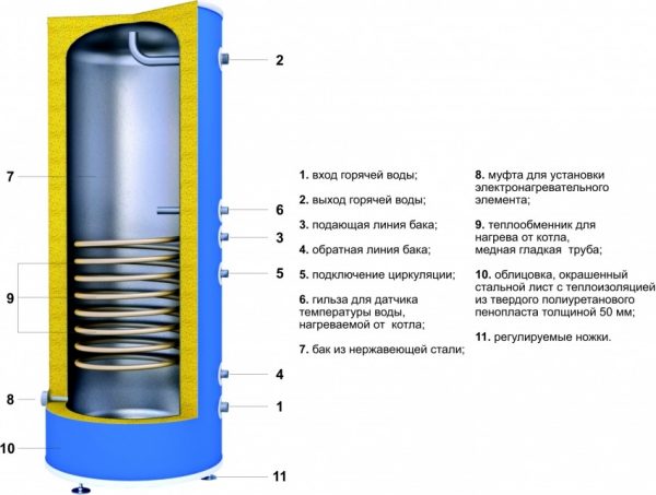 Water heated in the heating system passes through a coil heat exchanger (or between two tanks), where it gives off heat to the cold water accumulated inside the tank. The cooled coolant is returned to the heating circuit. After some time, thermal equilibrium is reached, and the water temperature in the boiler becomes equal to the temperature of the coolant.