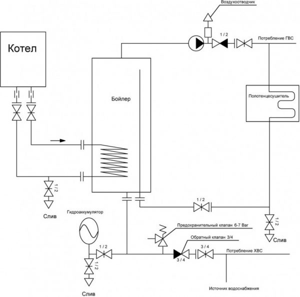 If the consumption of hot water is rare, it makes sense to install a dual-circuit circuit, where the heat carrier enters the tank separately from the heating circuit. Then, instead of a three-way valve, another additional pump is installed to pump the coolant into the boiler.