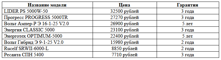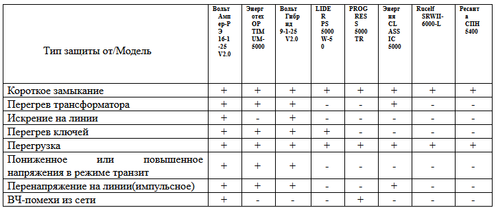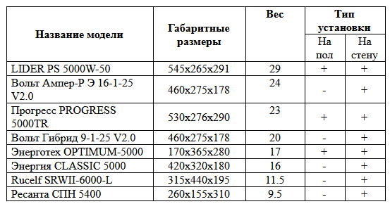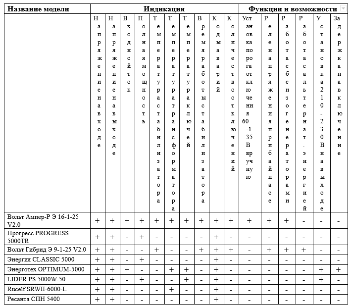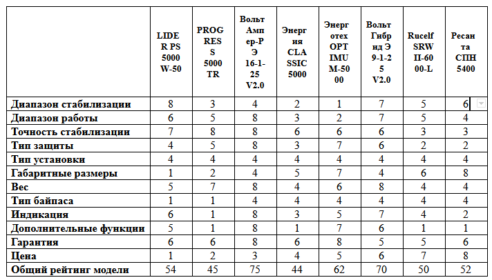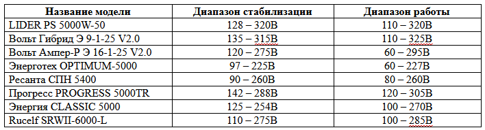When comparing certain models, the principle of selection for the widest range of operation and stabilization was used, which is usually one of the most frequent selection criteria after the price.