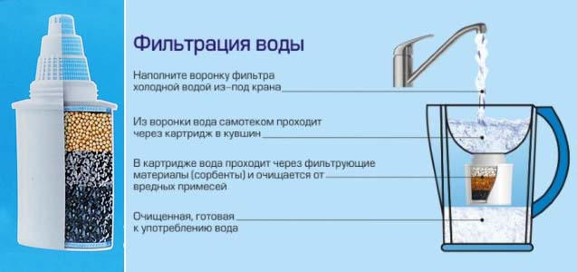 Small compact dimensions, light weight, ready to work without connecting water supply, electricity, just insert a cartridge and the filter jug is ready for use, long service life, low price are the main advantages of this cleaning method.