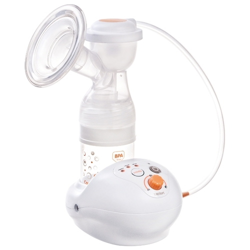 High-quality, inexpensive, no-frills electric breast pump. Powered by mains and batteries, standard equipment: funnel, bottle with lid and stand, nipple. It has 6 pumping modes, no display.