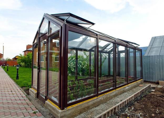 - Glass. Popular material for the construction of greenhouses. It has the following advantages: it transmits sunlight, good thermal insulation, tolerates temperature changes, long service life, beautiful appearance. Along with the pros, there are many drawbacks: heavy, because of which you need to install a powerful frame, fragile to mechanical damage, long installation.