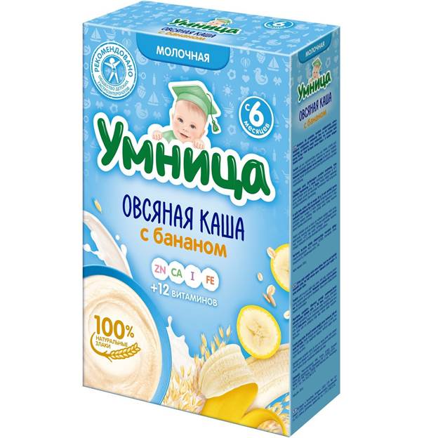 | The best milk porridge for the first feeding | Clever milk with banana and oatmeal | 100 | This inexpensive domestic porridge can be given to babies from six months. It has a pleasant taste and delicate texture, brewed without lumps. |