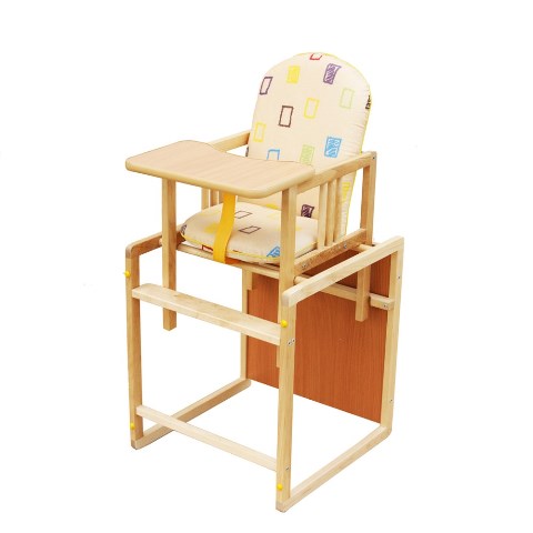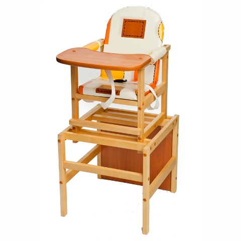 The chair is suitable only for children who have learned to sit without support. It is enough to remove the chair and turn the base over - and now the place for games and creativity is ready. Made of natural wood. Two backrest tilting modes and soft textile seat upholstery add comfort. A three-point seat belt keeps the child in the highchair.