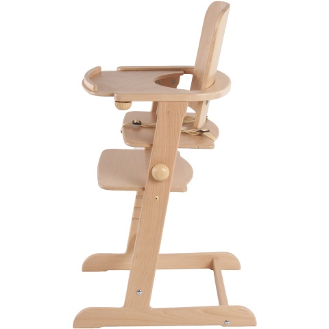 A chair completely made of wood for children from 6 months. Withstands weight up to 85 kg. Equipped with a three-point seat belt, removable worktop and footrest.