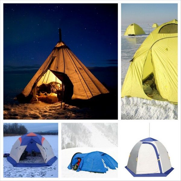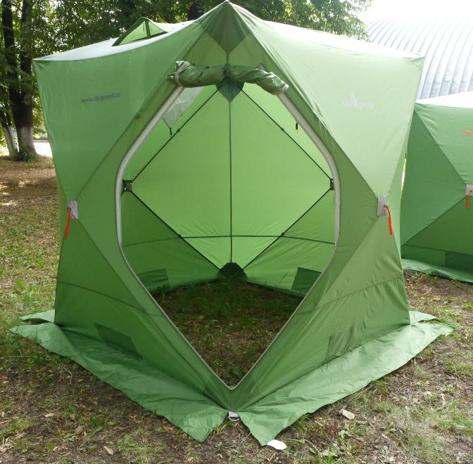 - The shape may also be different. The most common cube and umbrella. The first are more convenient, as they allow you to stand up to their full height. But the dome-shaped tent better resists the wind; snow does not linger on its surface.